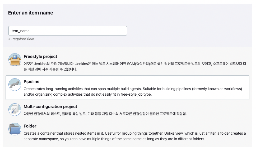 새로운 Item 클릭 후 Pipeline 을 선택한다.