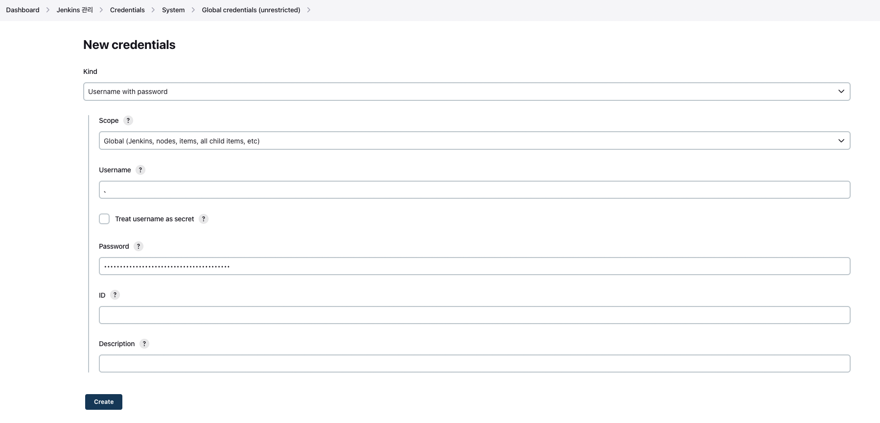 Username 은 젠킨스에 표시될 명칭을 기입해주고, Password 에는 위에서 생성한 토큰 값을 넣어준다.