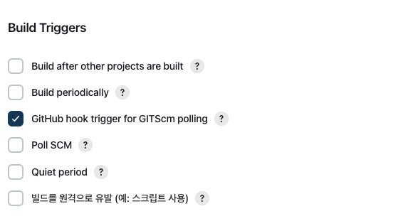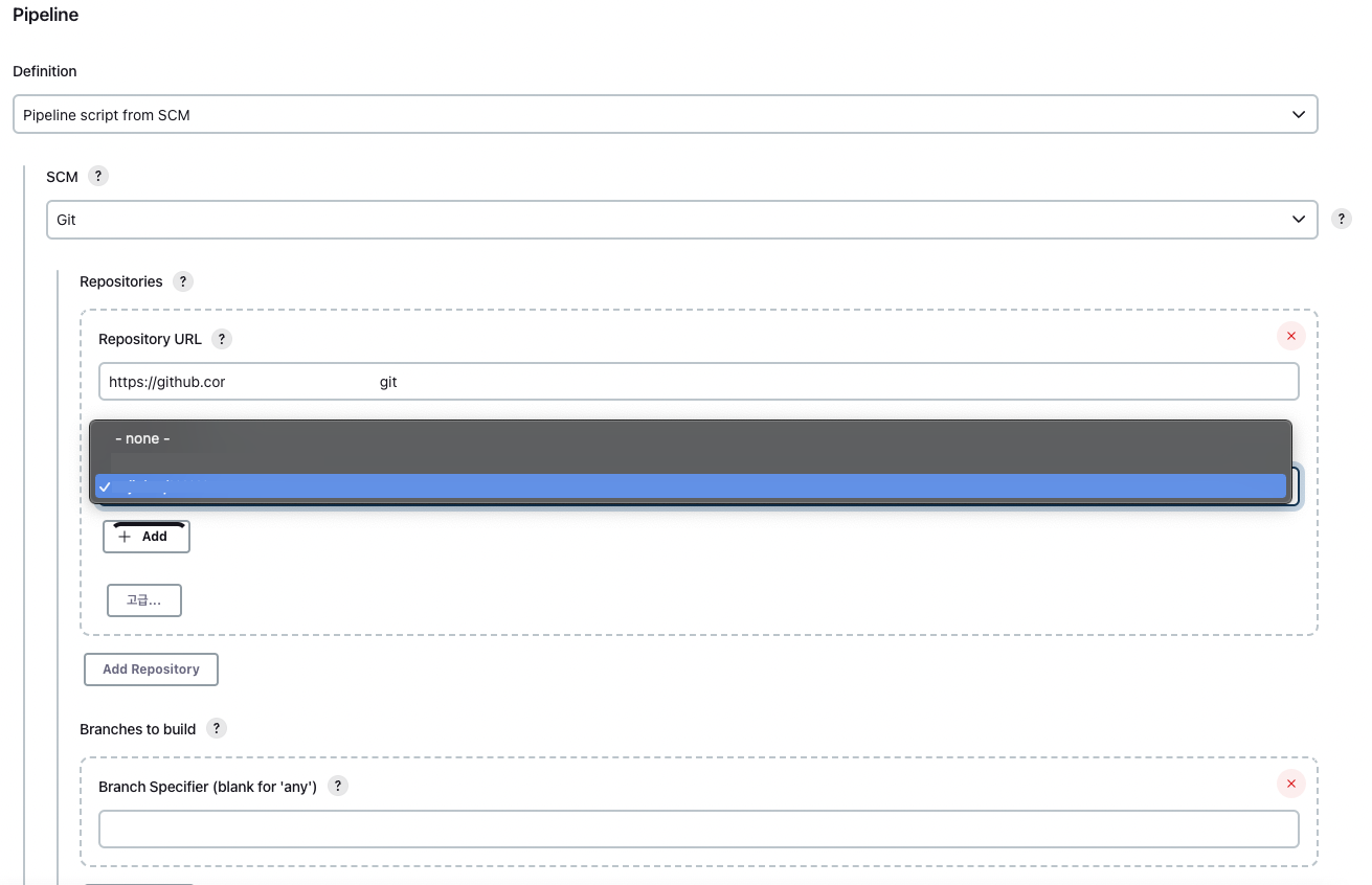 Repo URL 에는 깃 주소를 적어주고 Credentials 는 위에서 생성한걸 선택해주면 된다.