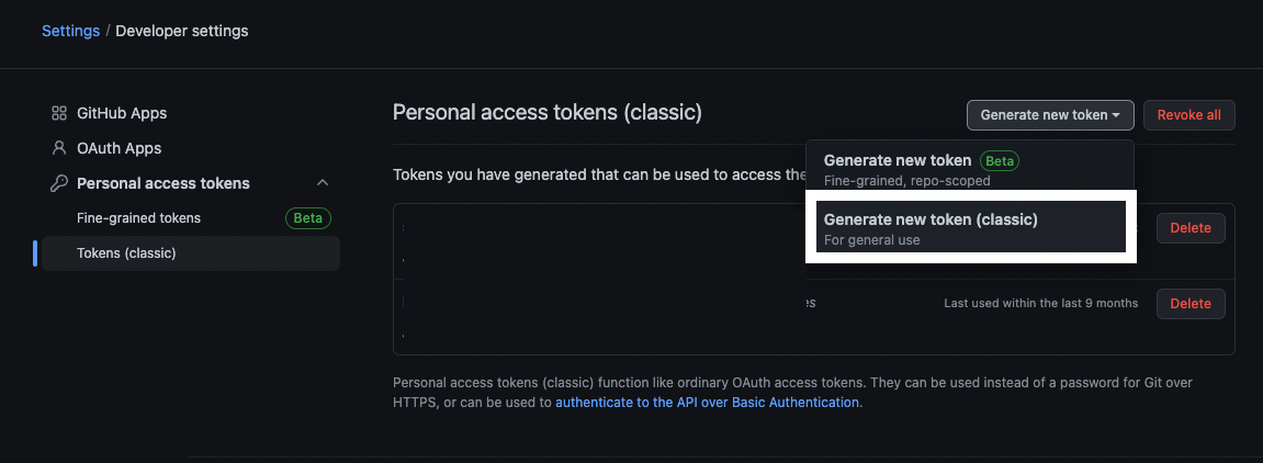 이후 (계정)Settings - Devloper settings - Personal access tokens - Tokens (classic)